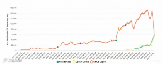 2026年初春,GitHub Copilot的曲线在VS Code安装量图表上骤然下坠——这位曾拥有2000万用户的AI编码先驱,在Claude Code与OpenAI Codex入场六个月内,就被竞品合力超越。