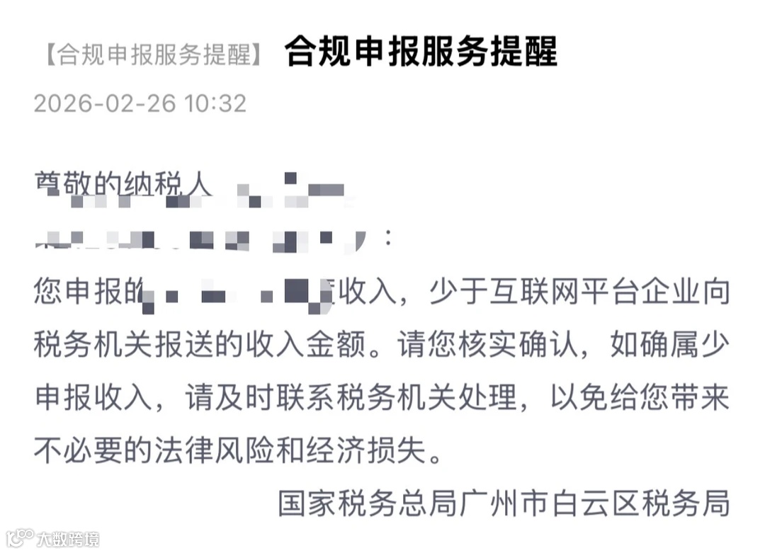 值得注意的是,这些提醒并非群发提醒,而是通过姓名和身份证信息精准匹配推送的。通知内容直指核心:“您申报的收入低于互联网平台企业向税务机关报送的收入金额,需进一步核实;如确属少申报,应及时联系税务机关处理。”