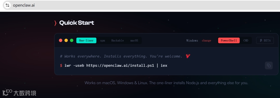 第一步:装好它访问https://openclaw.ai/后,往下拉找到 Quick Start,把那行命令复制下来,在 Mac 终端或 Windows PowerShell(管理员)粘贴一行命令并回车: