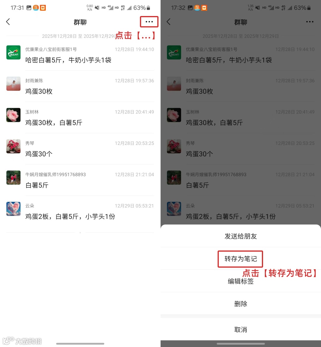 点击右上角的【…】,底部会出现弹出框,点击【转存为笔记】,微信会自动将当前页面的聊天内容以及发言人全部整整齐齐地整理在一个笔记窗口里!