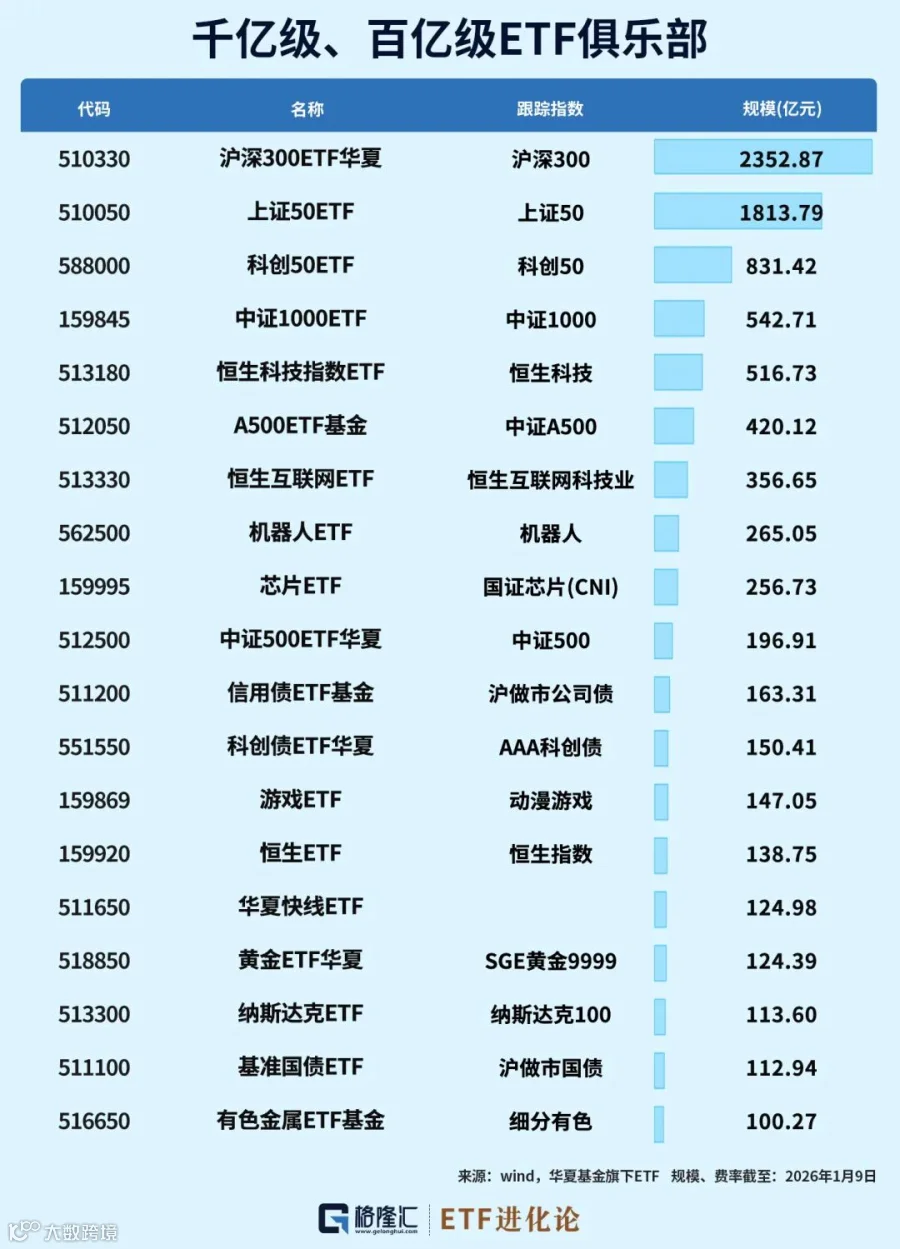 宽基领域:拥有沪深300、中证A500、上证50、中证1000等多个百亿级乃至千亿级旗舰产品,是市场流动性的定海神针。