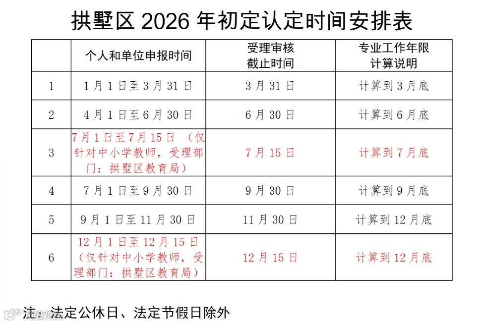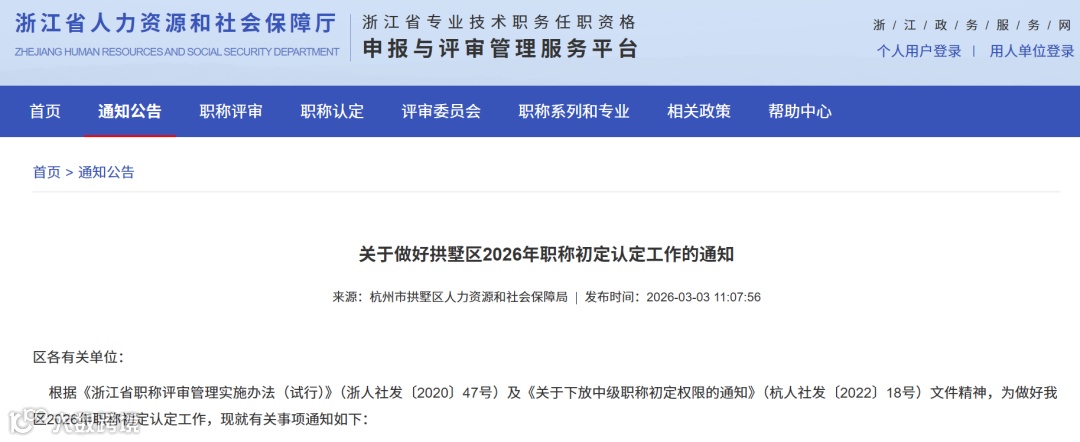 近日,杭州市拱墅区发布《关于做好拱墅区2026年初定认定职称工作的通知》,对26年度拱墅区职称初定认定工作做出相关规定安排。