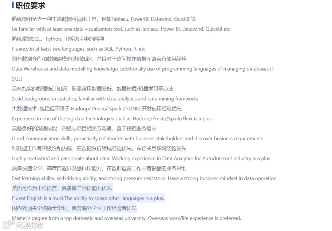 在蔚来的校招中部分岗位职责就有:英语作为工作语言,具有海外学习工作经验优先