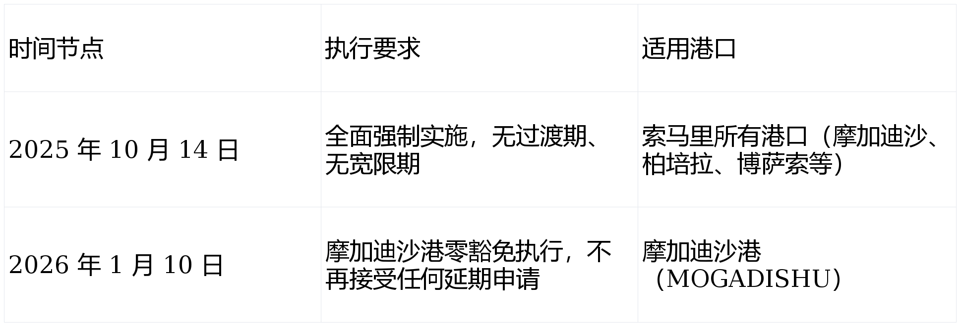 2025 年 10 月 14 日全面强制实施,2026 年 1 月 10 日起摩加迪沙港零豁免执行;所有海运货物必须办理,提单必须标注 ECTN 号 装船前获取 ECTN 号,到港前 5 天完成证书生效。