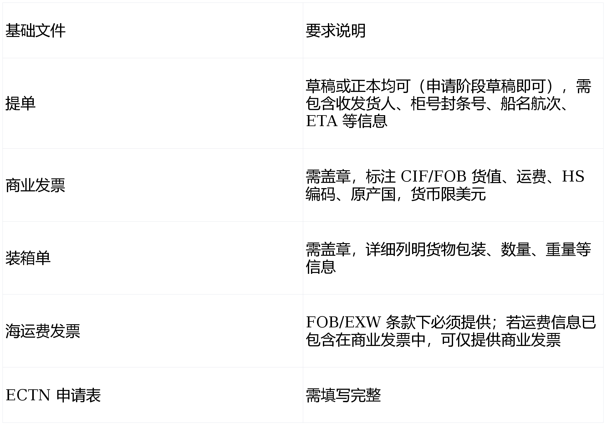 需要我根据你的货物情况(起运港、目的港、运输条款、货物品名 / HS 编码)整理一份可直接提交的 ECTN 申请文件清单和填写要点吗?