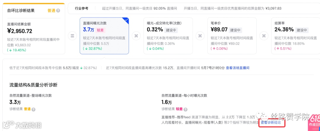 可以利用直播诊断功能观测整体数据表现,识别薄弱环节并针对性优化。重点观察以下几项关键指标: