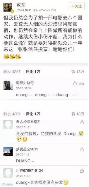成龙于2月24日晚发的微博下已被Duang党攻陷……