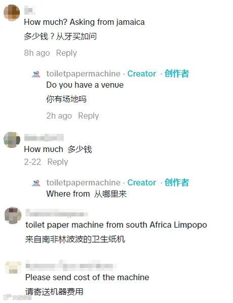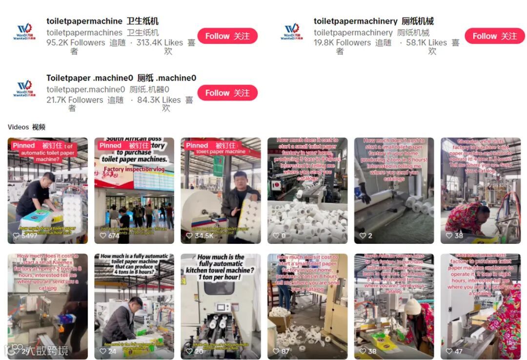 比如河南某机械企业在Tik Tok上有三个矩阵账号。它的营销内容称得上简陋——最简单的造纸机器运转视频,画面固定、光线随意,后期再加上简单配音,标题更是简单粗暴:
