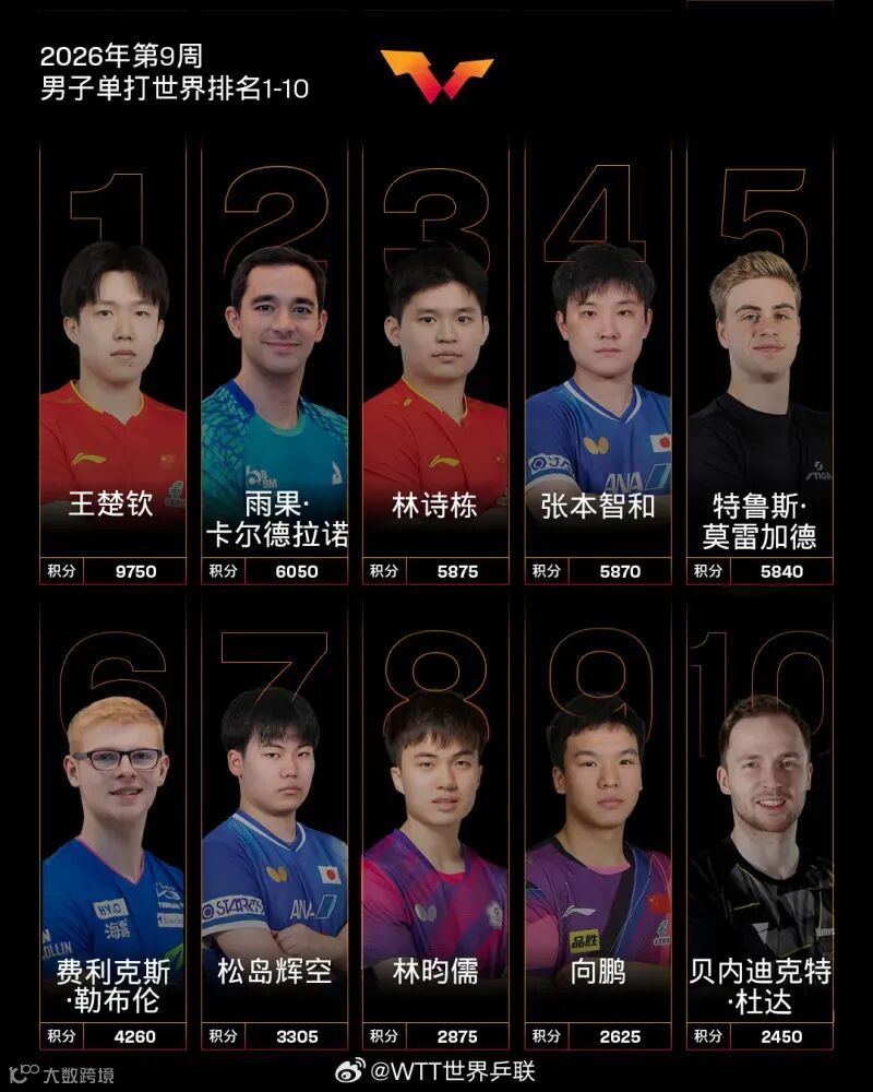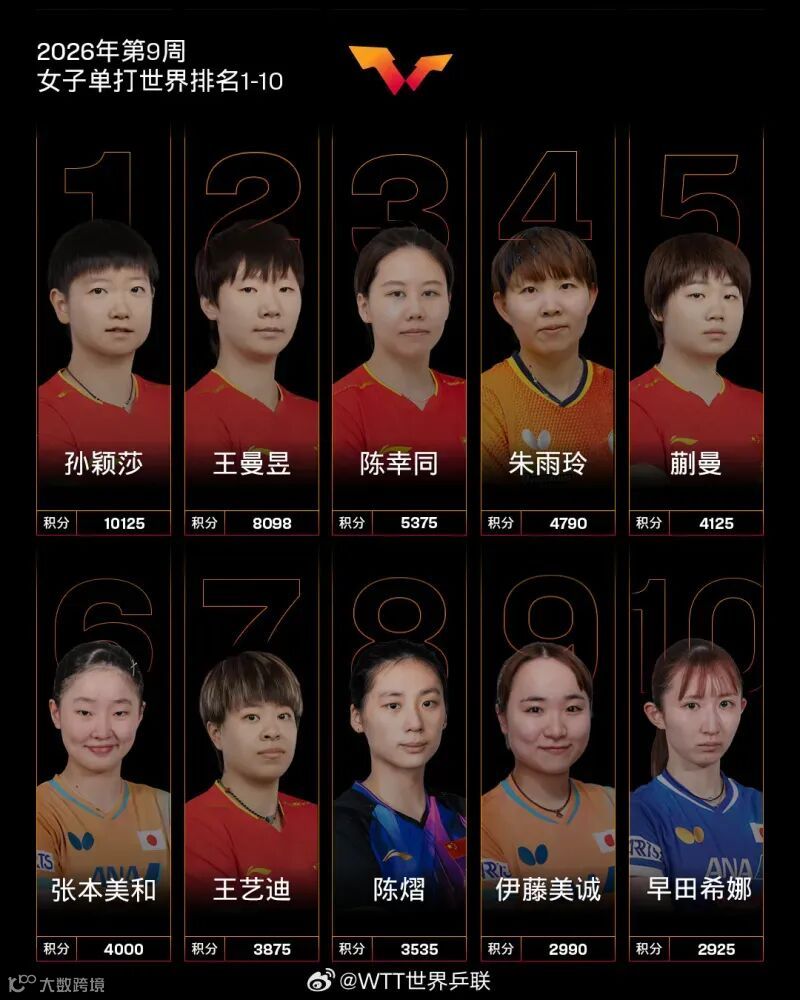 国际乒联2026年第9周世界排名已经公布,男单方面王楚钦领衔国乒三人分列前十,女单孙颖莎孙颖莎、王曼昱、陈幸同位列前三,国乒共六人占据女单前十。