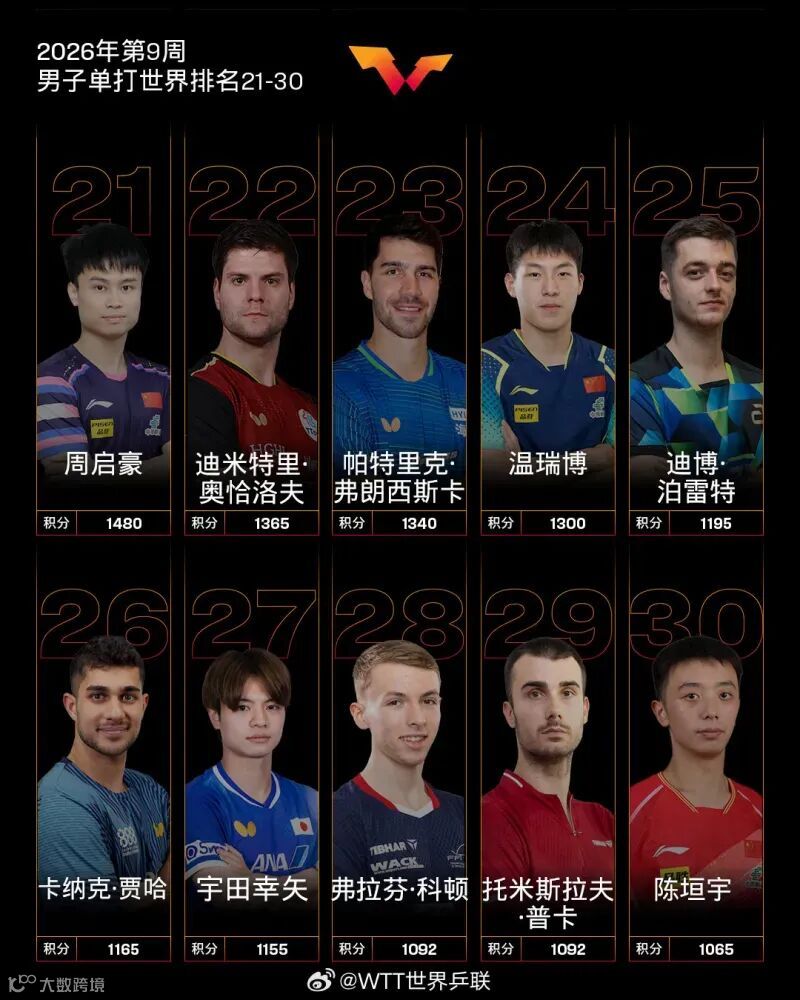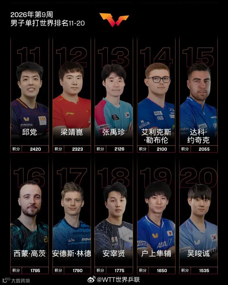 其他中国队球员,梁靖崑排名第12,周启豪排名第21,温瑞博排名第24,陈垣宇排名第30,陈俊菘排名第37。
