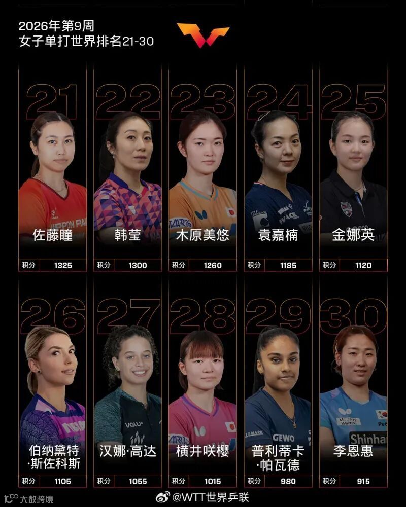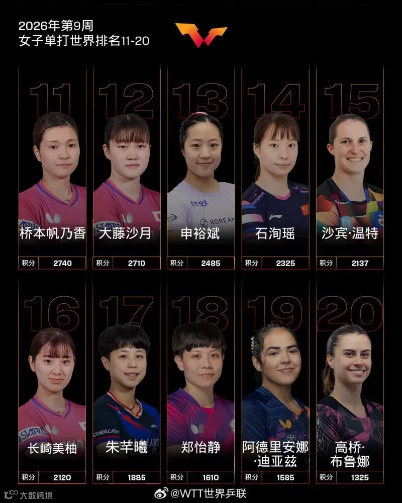 郑怡静排名上升1个名次位列第18;阿德里安娜-迪亚兹排名上升1个名次位列第19;高桥-布鲁娜排名上升1个名次位列第20。