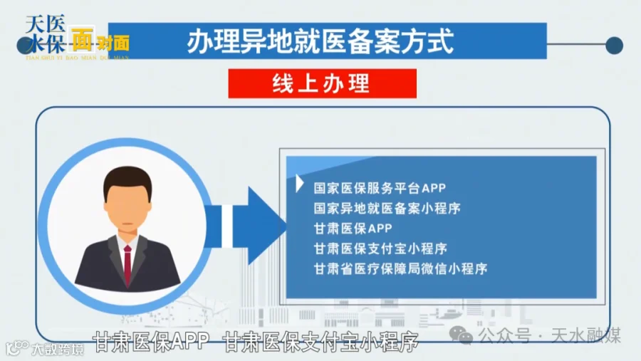 答:有线下和线上两种办理方式。线上是主要办理方式,可通过国家医保服务平台APP、国家异地就医备案小程序、甘肃医保APP、甘肃医保支付宝小程序、甘肃省医疗保障局微信小程序办理。