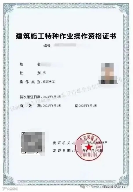 全称为建筑施工特种作业操作资格证,专用于建筑施工现场电工岗位。