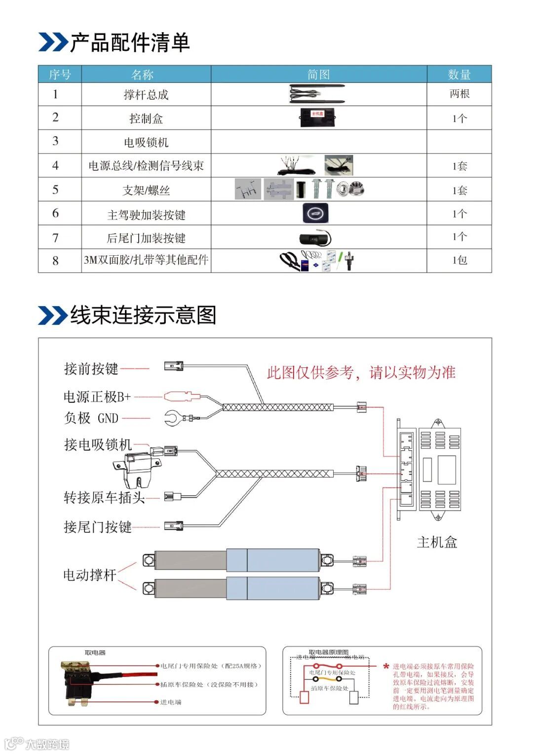1、为了安全和确保本产品正常使用,请交由销售本产品的专业人员或经培训人员安装,切勿私自拆卸安装,以免造成产品损坏及安装事故发生; 2、安装前先应向车主确认此车尾门是否改装或维修过,检查汽车仪表是否存在有显示故障码,车内按键操作功能及遥控钥匙按键等各项功能是否正常,检查车内饰/外观表面是否有刮花现象,原车尾门缝隙左/右大小与高低平整度,如有异常请及时告知车主; 3、确保汽车电瓶有足够电量保证电动尾门正常运行,如电量不足,请启动发动机一段时间,以免影响电动尾门的正常运行和汽车启动。 4、为了防止在拆装的过程中对汽车漆面、座椅或内饰等造成损伤,安装人员应先取下身上所携带的金属物品及其他硬物,注意拆下的汽车饰板组件要放置好,避免刮花各汽车饰板组件; 5、请根据本说明书的布线方式布好各条线束,一定要用扎带将各线束与原车线束扎在一起,检查线束不要位于卡扣孔或螺丝孔位置,避免安装车内饰板卡扣与螺丝时将线束压伤; 6、部分线束的端子在出厂时尚未插胶壳,布好线束后为了避免端子碰在一起造成短路,穿完线束后需先插胶壳,再接通电源; 7、本说明书里面所有图片仅供参考,不同配置的车型图片可能会有差异,但是装方法相同。 8、请勿在开机状态下插拔已连接好的相关引线,以免插拔时损坏主机或其他配件。 |