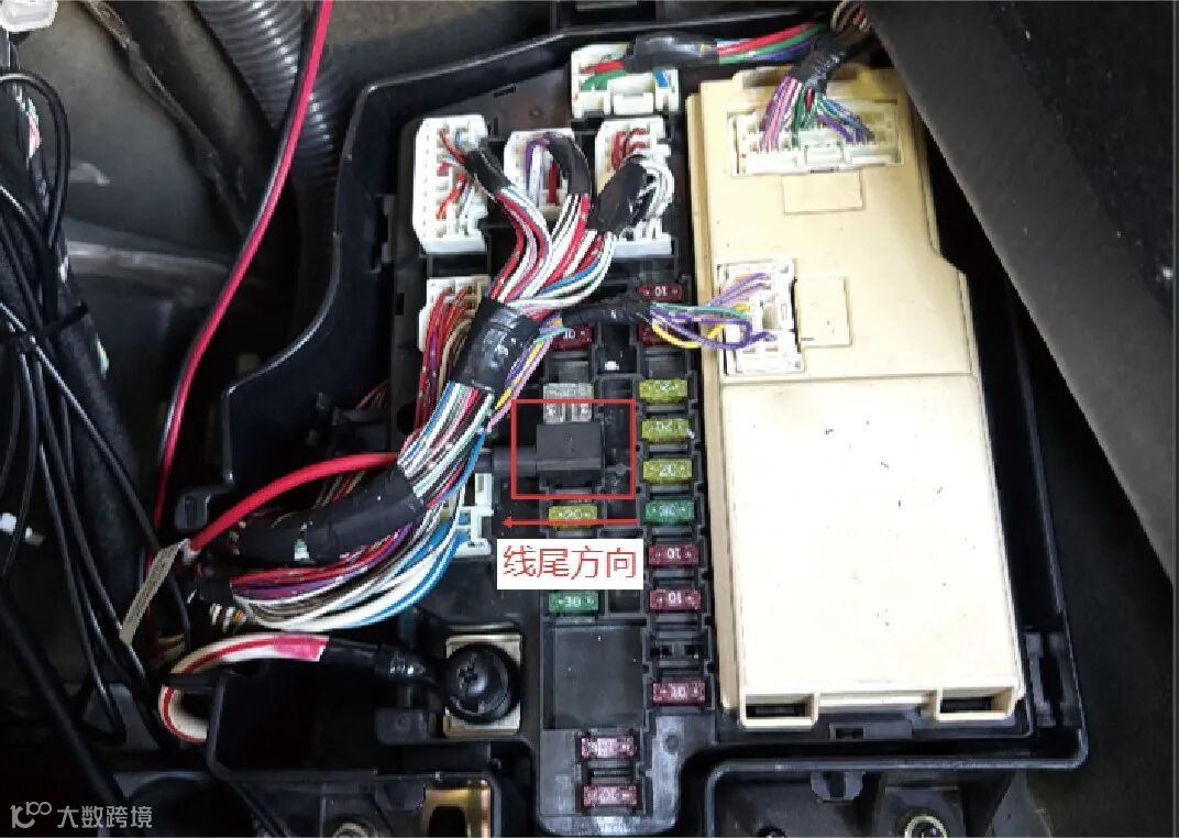 14.将取电转接器接到保险盒12V常电的位置上,注意进电端,如拔下原车保险,务必将原车保险插在我司取电器上,如图