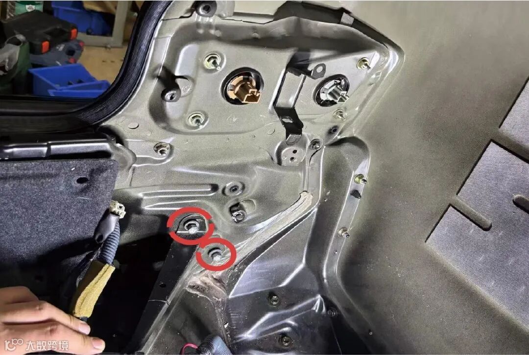 4.拆掉下图所示原车螺丝放一边备用,左右一样(图示为左侧孔位)