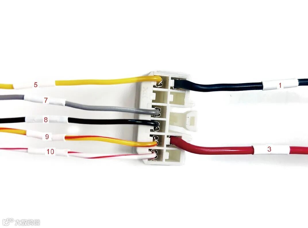 10.电源线端子按示意图插到胶壳内。(注:不足十条线的车型只需按颜色或对应标号插入即可)