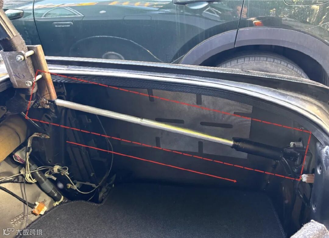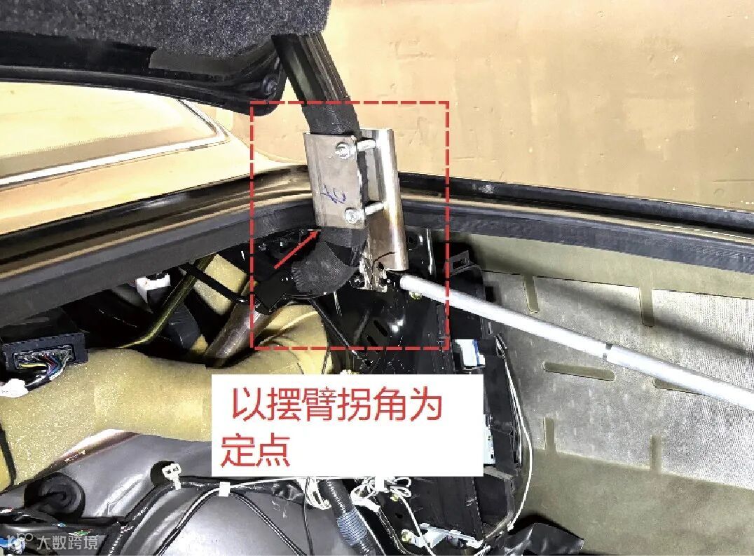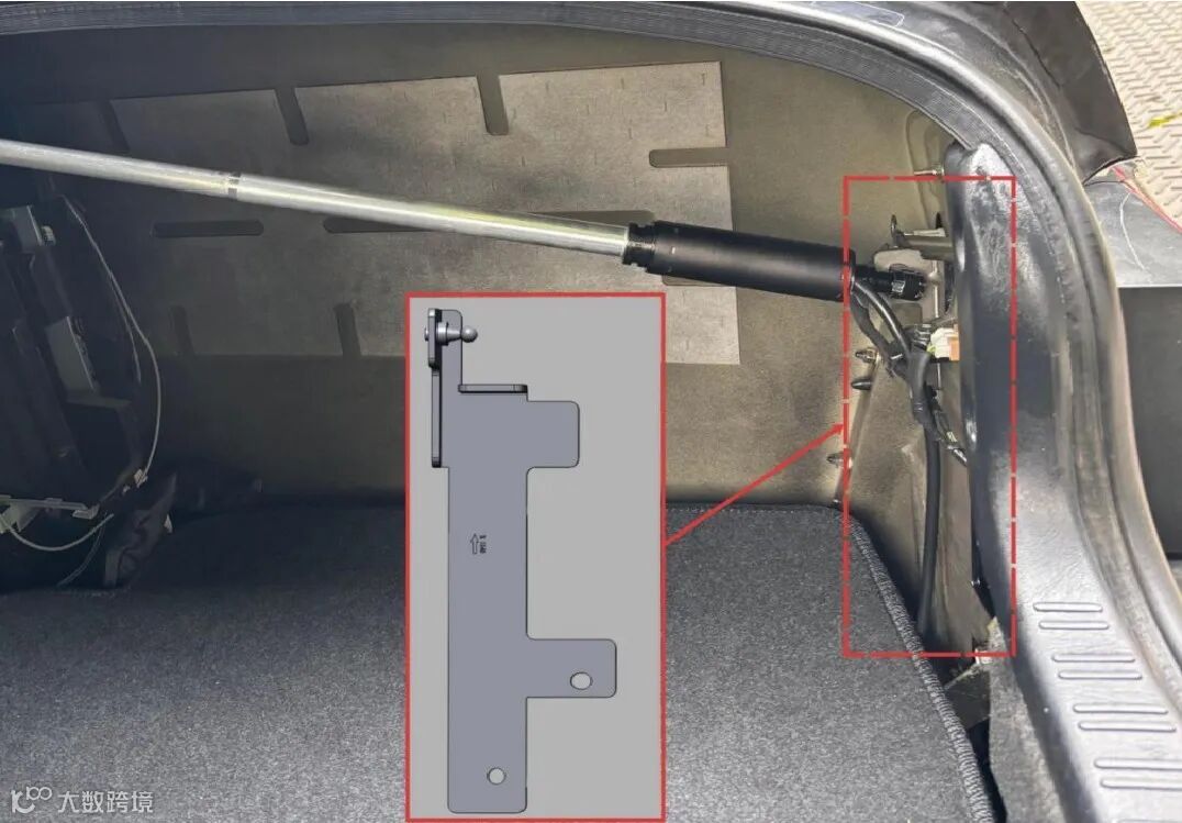 7.安装电动撑杆,撑杆出线端朝车尾方向,撑杆安装上后注意检查撑杆球头卡片是否卡到位,左右一样(图示为右侧撑杆)