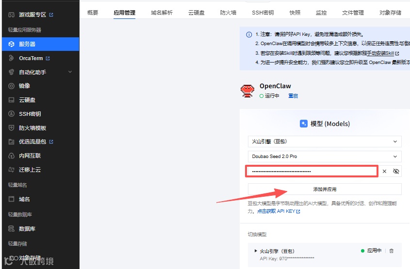 复制完成后返回控制台OpenClaw配置面板,将复制的API Key填入模型配置的卡片,然后单击添加并应用按钮