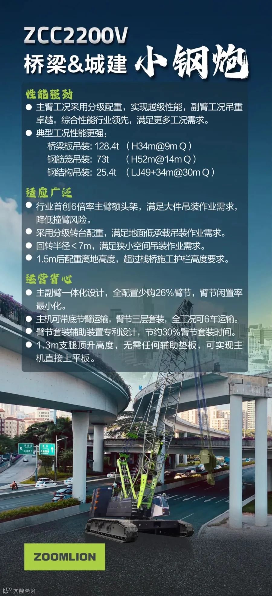 主臂工况采用分级配重,实现越级性能;副臂工况吊重表现卓越,综合性能行业领先,适应多种作业场景。