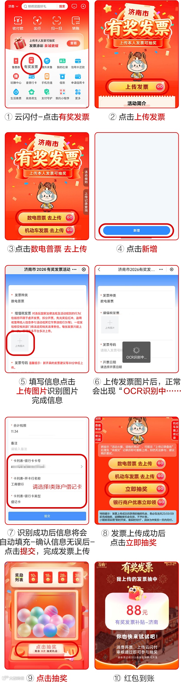 立即抽奖:分为88元、58元、38元、28元、18元、10元、8元七个等级。发票金额越高,抽到大额红包的概率越大。