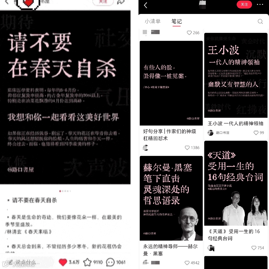 这类图文,精准戳中年轻群体的情感痛点,比如精神内耗、爱情困惑等等,用作家语录搭配氛围感图片,短时间内快速传递共鸣,简洁又吸睛。