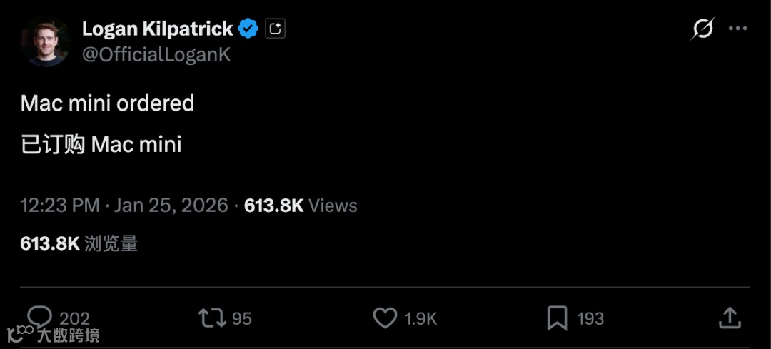 Mac mini也因为便于OpenClaw的安装在几周内订单数暴涨,甚至Google的 Google AI Studio 的负责人,Logan Kilpatrick 都发 X 说,「我已经下单了 Mac mini」。