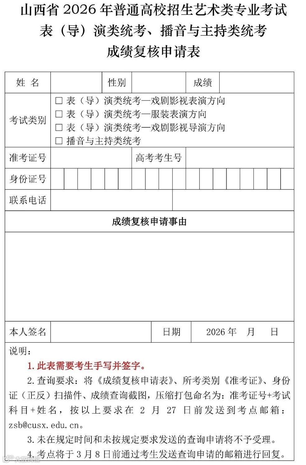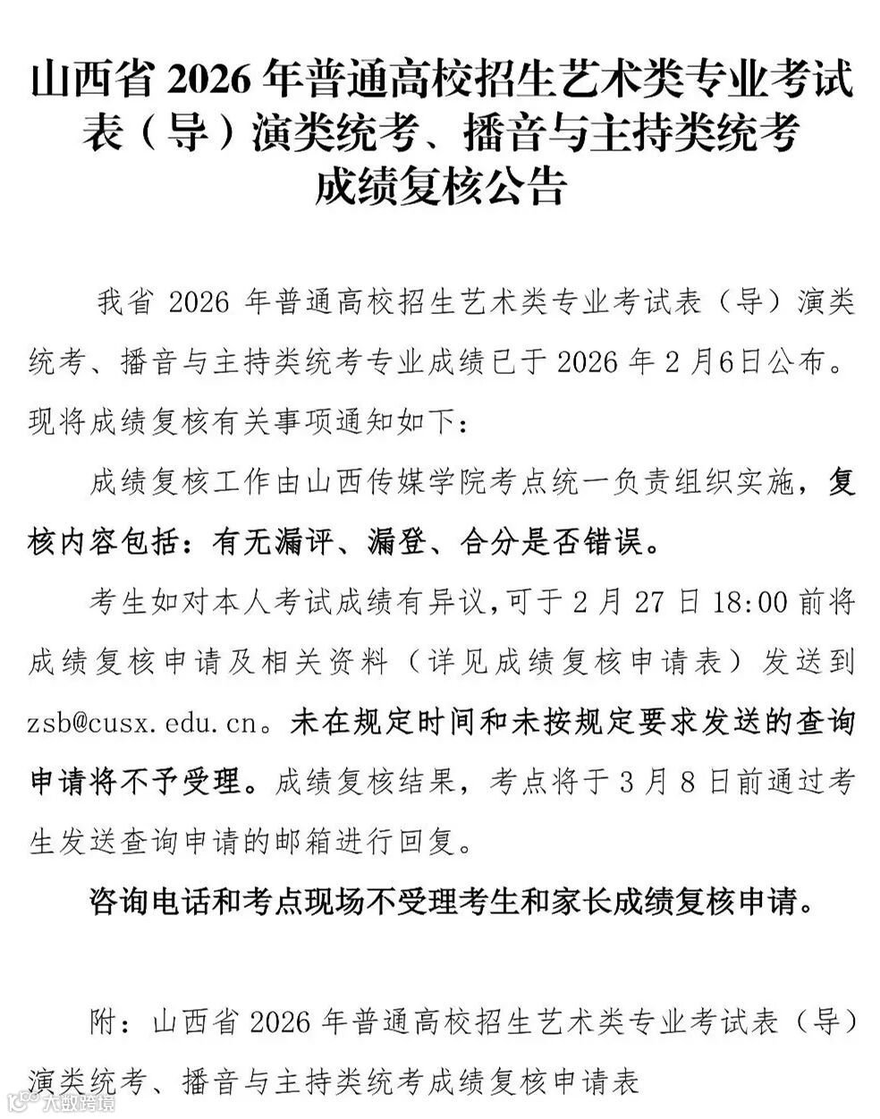 考生如对本人考试成绩有异议,可于2月27日18:00前申请有关考试成绩复核。考试成绩复核按照《山西省2025年普通高等学校招生考试成绩复核实施办法》执行。音乐类和舞蹈类考生可到县(区)招办申请成绩复核;播音与主持类、表(导)演类考生请查看《山西省2026年普通高校招生艺术类专业考试表(导)演类统考、播音与主持类统考成绩复核公告》。