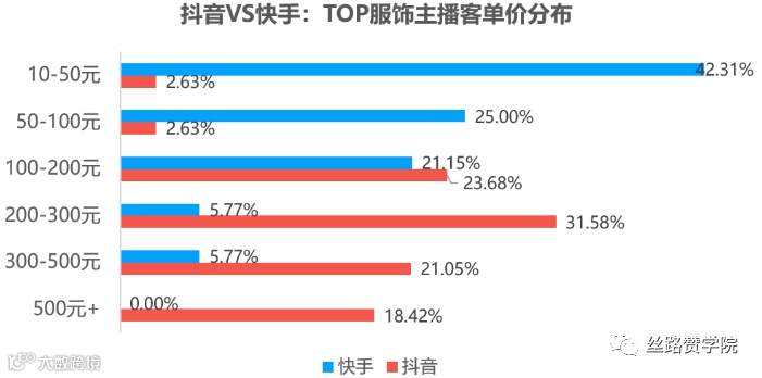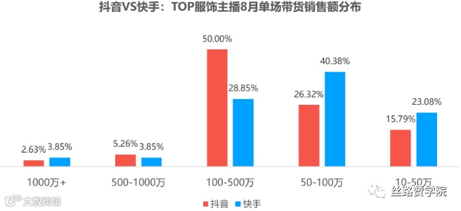 数据显示,快手在粉丝量超过百万的服饰类主播数量方面明显领先抖音,说明快手平台对服饰品类的关注度更高、主播成长空间更大。