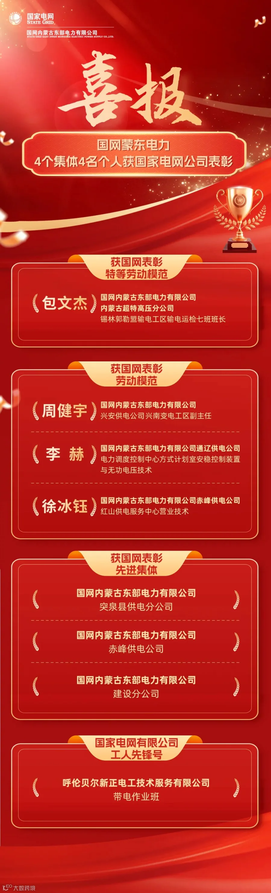 1月15日,国网蒙东电力—批先进集体和个人在国家电网有限公司第五届职工代表大会第一次会议暨2026年工作会议上受到表彰。其中,国网蒙东电力1名员工获评国家电网有限公司“特等劳动模范”,是国网蒙东电力成立以来首次荣获该项荣誉。国网蒙东电力3名员工获评“国家电网有限公司劳动模范”,3个集体获评“国家电网有限公司先进集体”,1个集体获评“国家电网有限公司工人先锋号”。