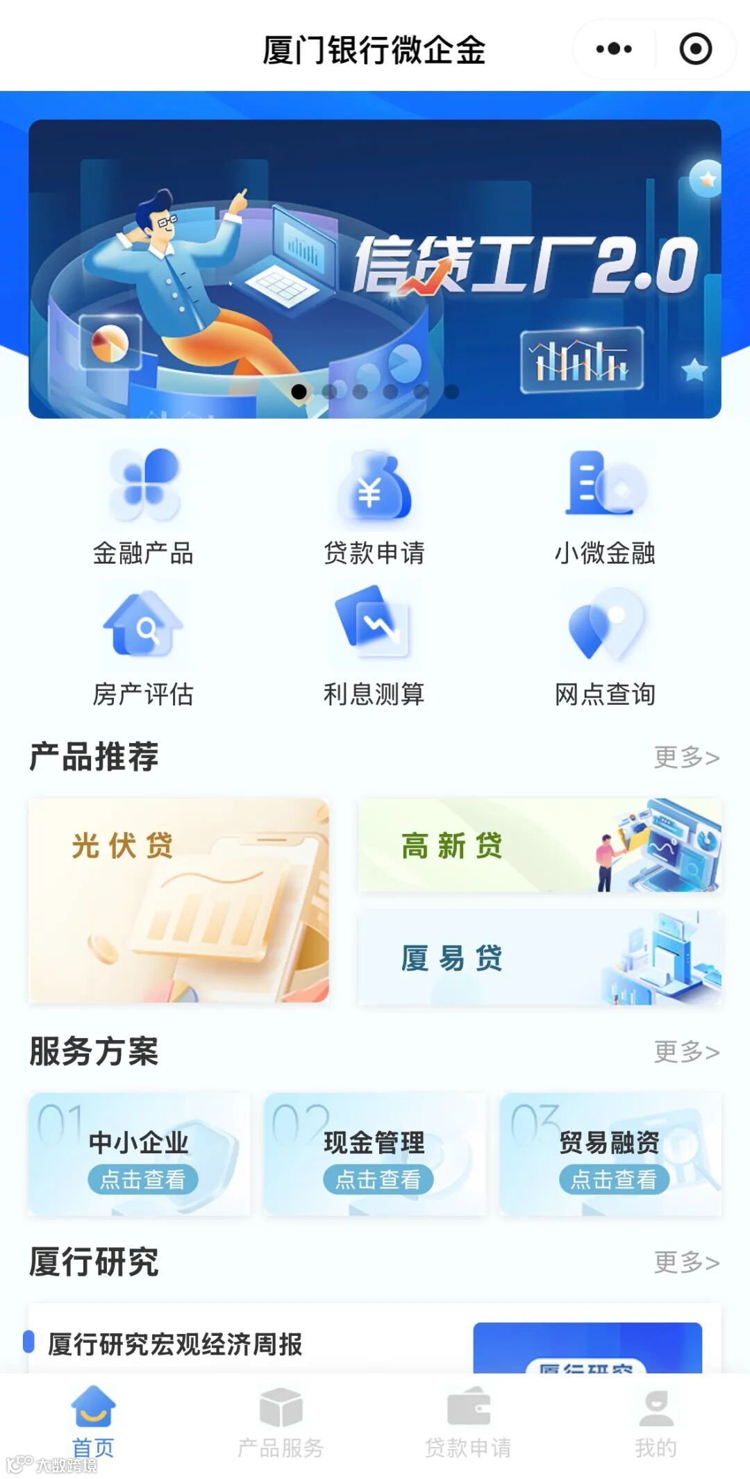 全新版本的厦行微企金,整合产品推荐、资讯推送、服务方案等多元功能,打造一站式企业金融服务平台。首页即入口,服务全覆盖。