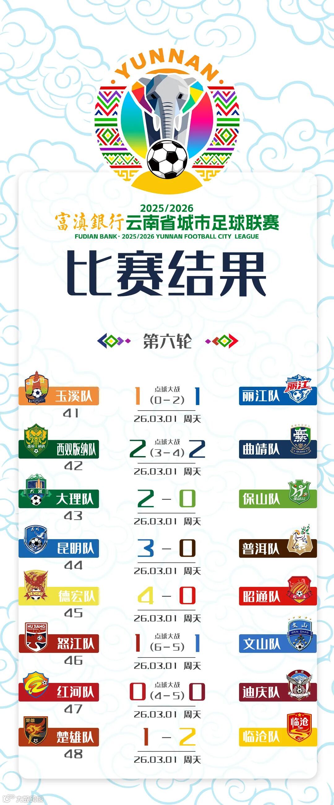 玉溪1-1丽江(点球0-2)。第六轮焦点战,玉溪对阵丽江。第11分钟,玉溪9号顾文祥左路倒三角传中,14号石连云推射破门,主队先拔头筹。第59分钟,丽江2号和根新禁区内接队友传中铲射破门,扳平比分。常规时间双方1-1战平,比赛直接进入点球大战。玉溪队前四罚全部失手,点球大战0-2不敌丽江。此役过后,丽江先后通过点球大战击败曲靖、玉溪两大强敌,继续保持联赛不败。
