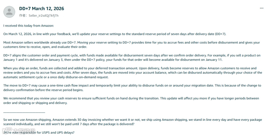 自2026年3月5日起,亚马逊在全球范围(德国站延至3月12日)推行DD+7(送达后7天)资金预留政策:订单确认送达后第7日才释放货款,多数订单实际回款周期延长至8–9天。建议卖家优化物流追踪、评估FBA使用、调整供应商账期以降低现金流压力。