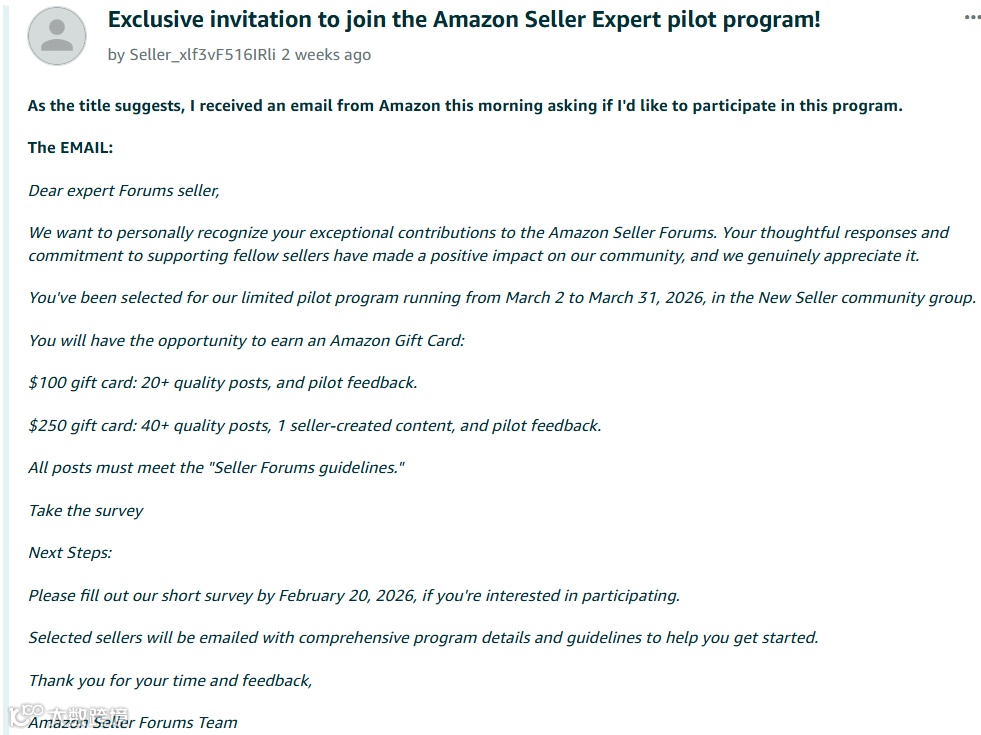 面向美国、英国、日本和印度的活跃卖家开放,试点期为2026年3月2日至31日。参与者发布20条优质帖可获100美元礼品卡;发布40条帖并提交原创内容及体验反馈,可获250美元礼品卡。计划覆盖FBA、品牌备案等核心运营主题,旨在提升卖家论坛互助氛围。