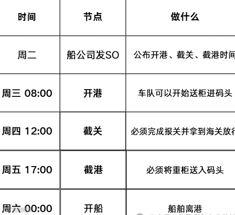 订舱确认后,船公司会发SO(订舱单),上面会明确标注开港、截关、截港时间。
