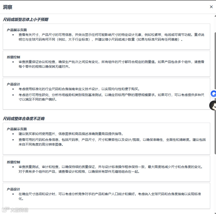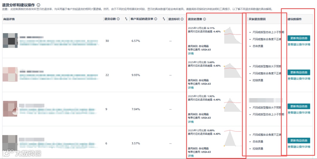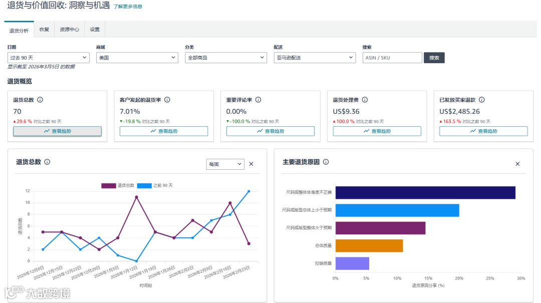亚马逊已上线“退货与价值回收”功能,卖家可在后台直接查看退货原因分布、获取平台级操作建议,并联动买家之声(VOC)与AI分析结果,形成“数据洞察—产品迭代—文案优化—客诉响应”闭环: