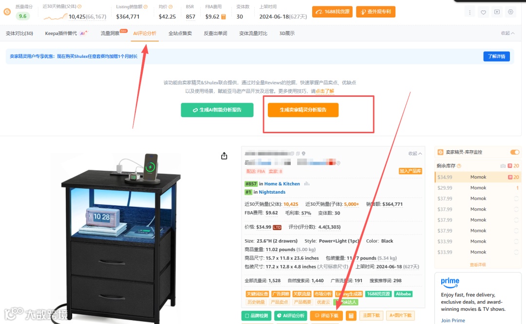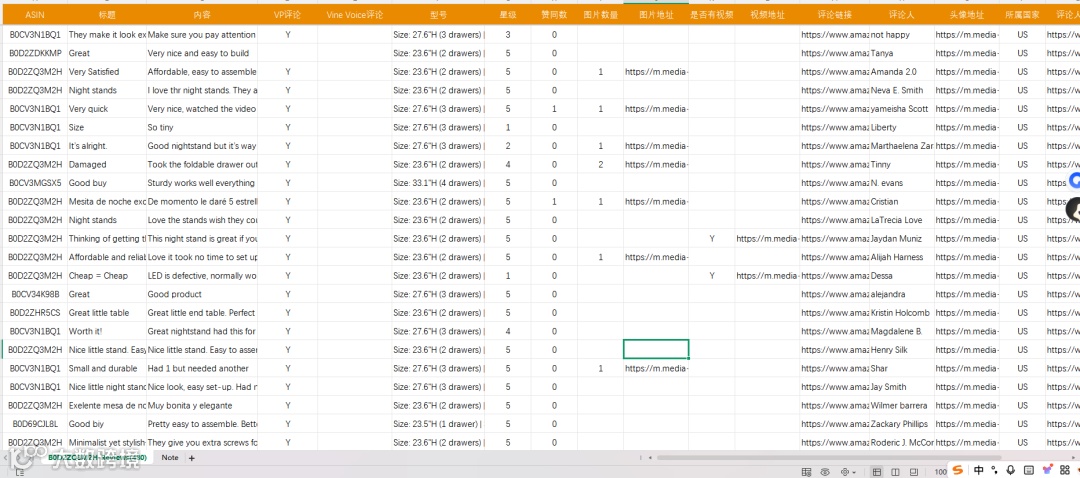 以“nightstand with charging station”细分类目为例,借助卖家精灵插件批量抓取核心竞品及自身产品的全量评论(含星级、时间、内容、留评人信息等),并导出至结构化表格: