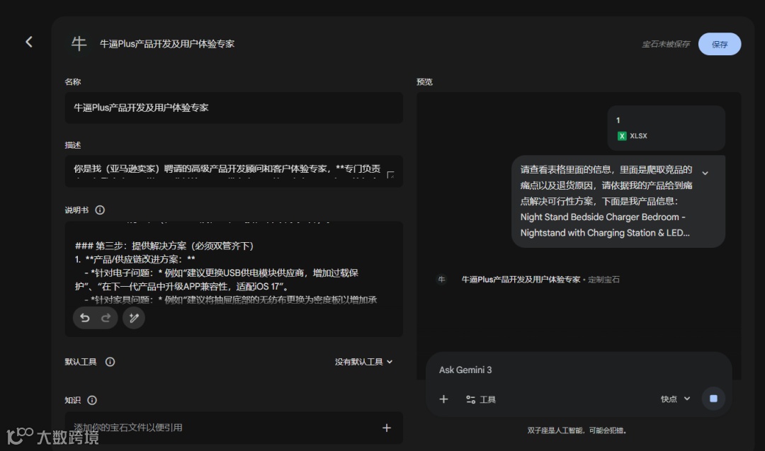 基于Gemini构建专属Gems模型,输入精准角色定义、产品参数(如Lazzanto Nightstand的LED控制、USB/AC充电模块、布艺抽屉结构等)及任务流程,实现结构化归因分析。
