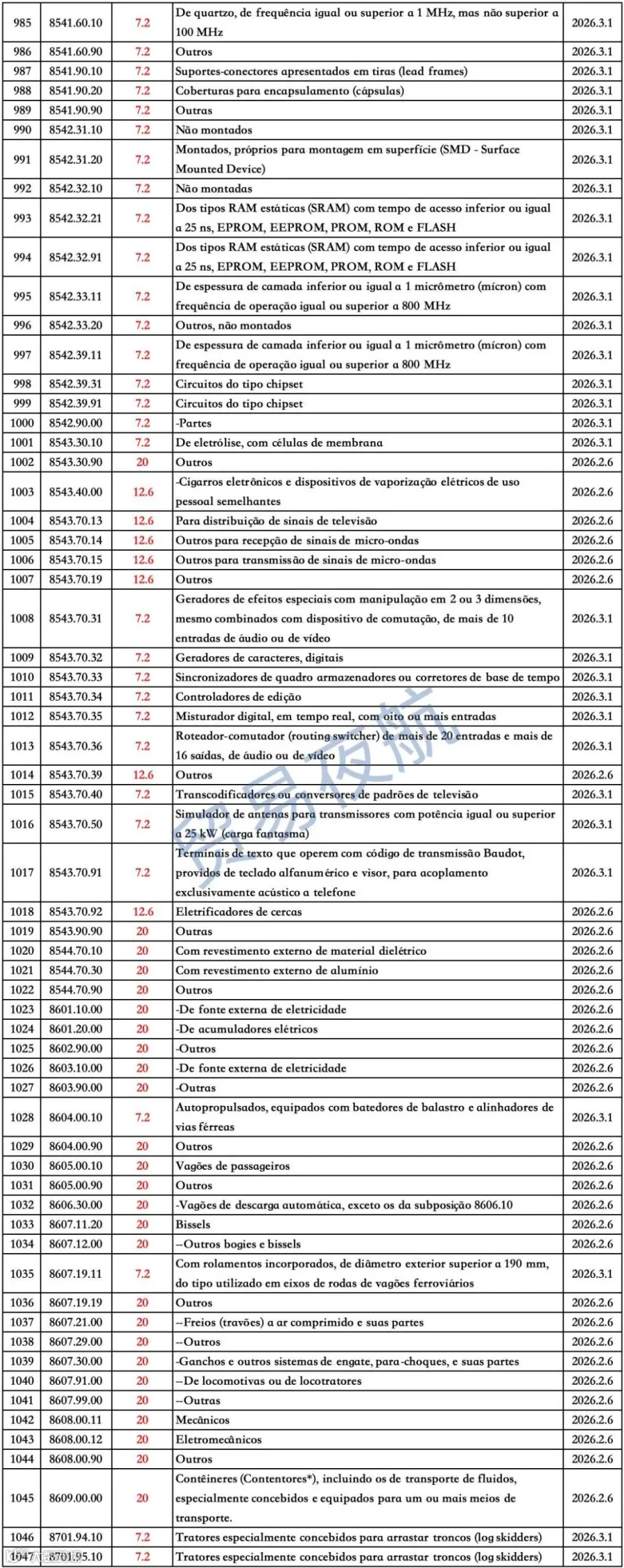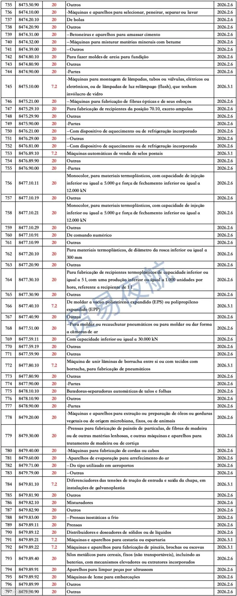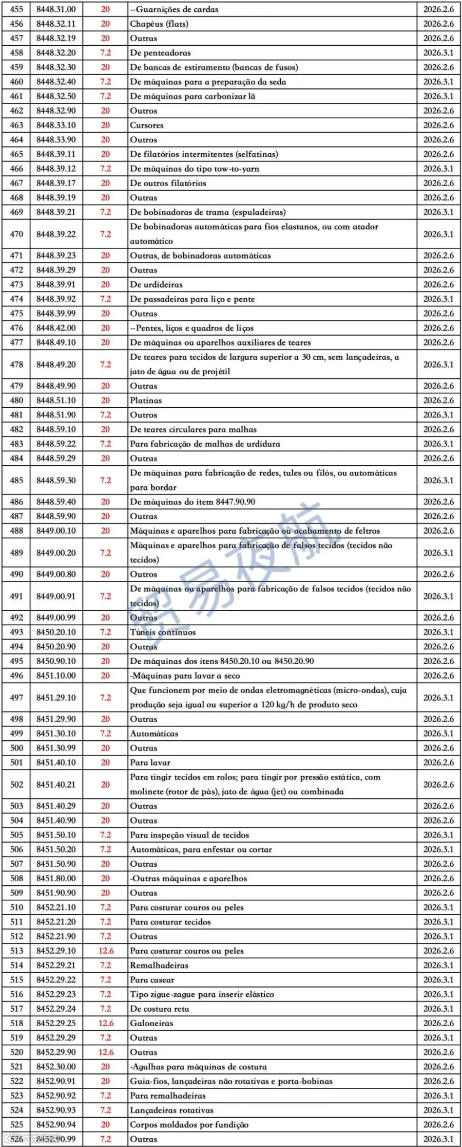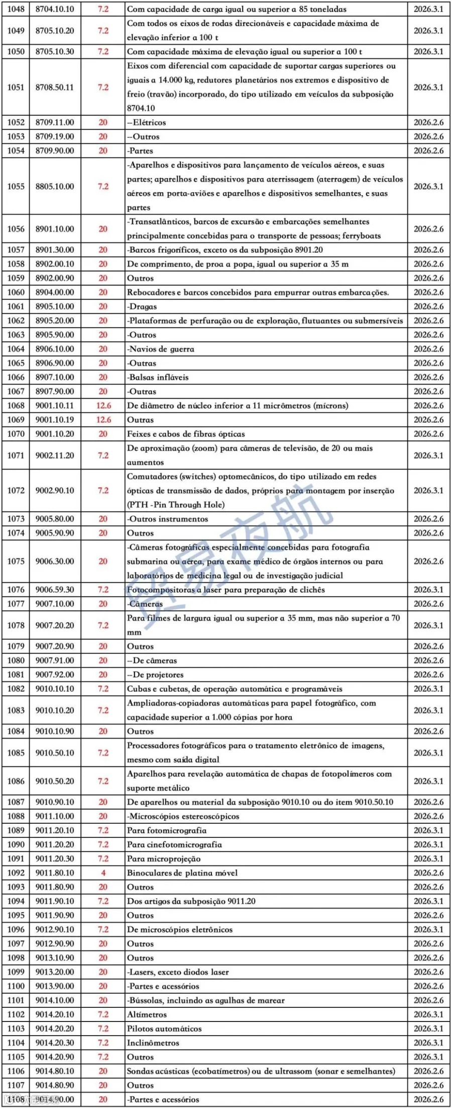 - 豁免安排:对巴西国内无同类产能的工业零部件维持零关税;2026年2月27日,GECEX发布补充决议,对105个产品授予临时零关税豁免,并维持15个产品的原有税率不变。