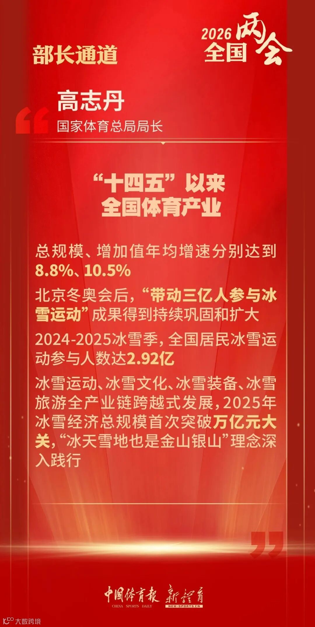 3月9日,十四届全国人大四次会议“部长通道”上,国家体育总局局长高志丹就“十五五”体育发展新举措、体育产业高