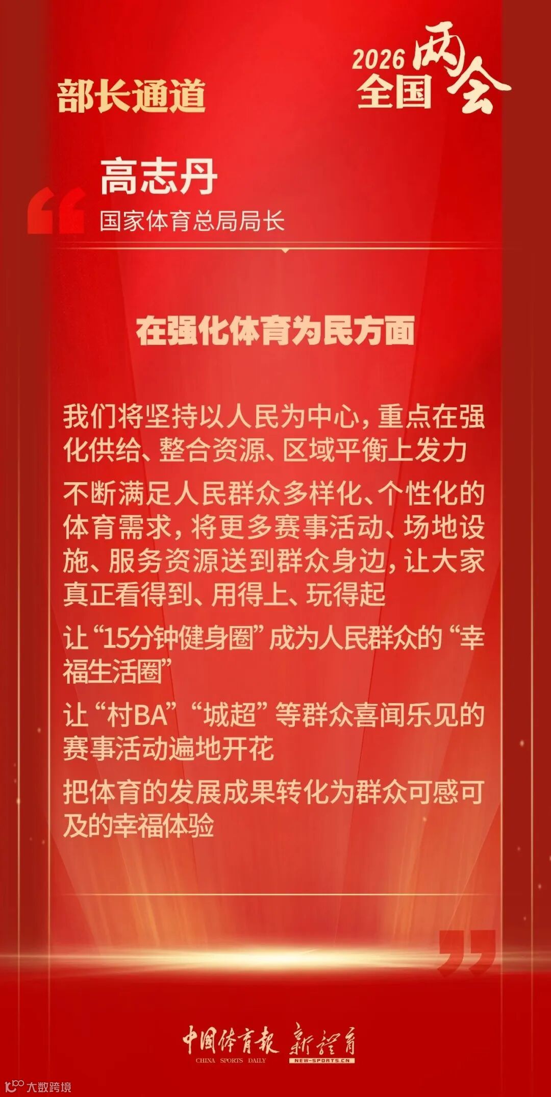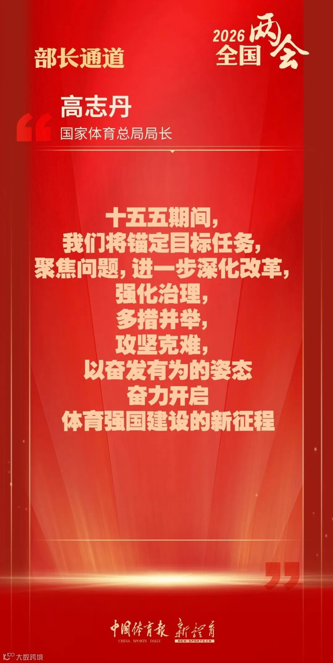 发展等社会关心的问题回答记者提问,系统阐述未来体育工作的发展方向与实践路径,为加快推进体育强国建设凝聚共识、擘画蓝图。体育强国建设道路上,每个人都是参与者、实践者、见证者,希望大家一起携手努力,共建体育强国!