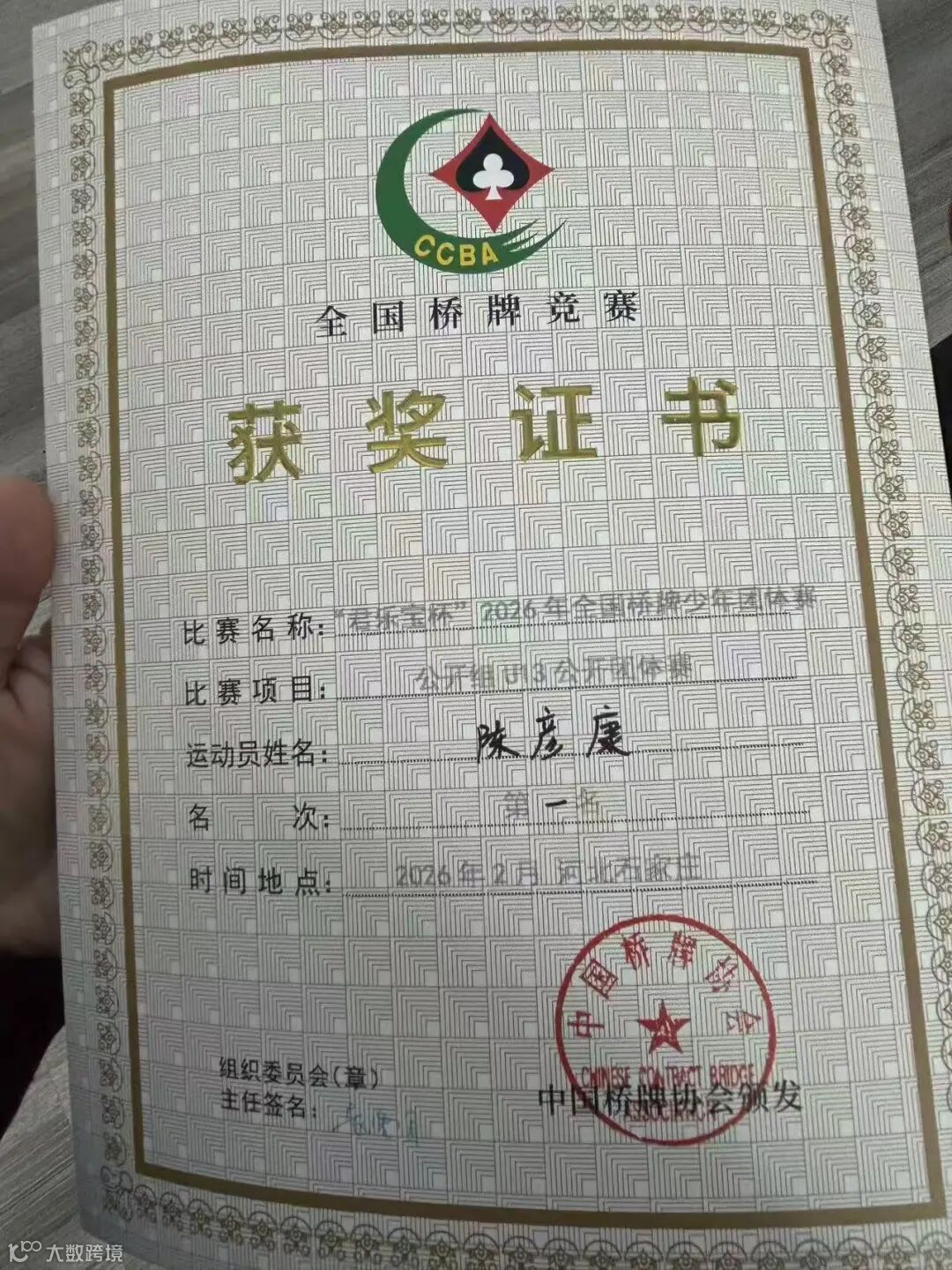 2月8日上午,石家庄前线传来欢欣鼓舞的消息:你所在的杭州维述队,获得了2026全国桥牌少年团体赛U13公开组冠军,这是杭州维述俱乐部在该项赛事上首次夺冠,也是杭州桥牌在该项赛事上的首次夺冠。