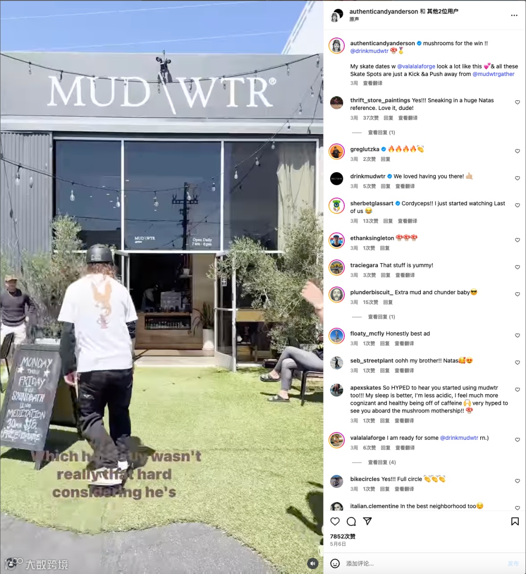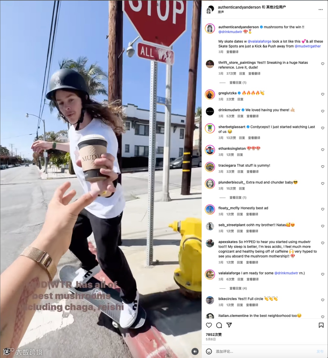 Andy Anderson,一位职业滑板运动员和艺术家,不仅拥有高超的技术,更是具备高水平的审美,能在滑板上完成各种各样的装饰和绘画。在圈子里的名气很大,其Ins账号拥有64.3万的粉丝关注。且都是喜欢且敢于尝试新鲜事物的年轻人,和MUD\WTR的目标客群画像高度一致。