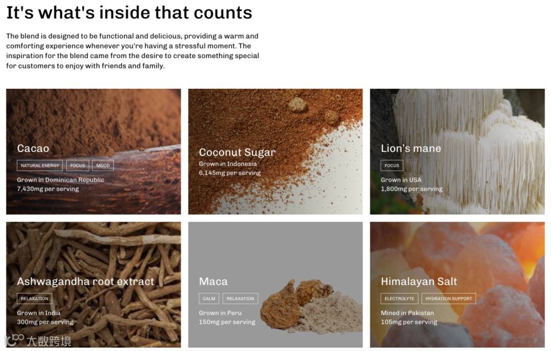 按照官方说法,品牌创始人将可可(Cacao)、马萨拉茶(Masala Chai)、功能性蘑菇与多种草本香料相结合,调配出一款颇具“草本风味”的混合饮品,并成功打出声势让不少消费者尝试并逐渐接受。