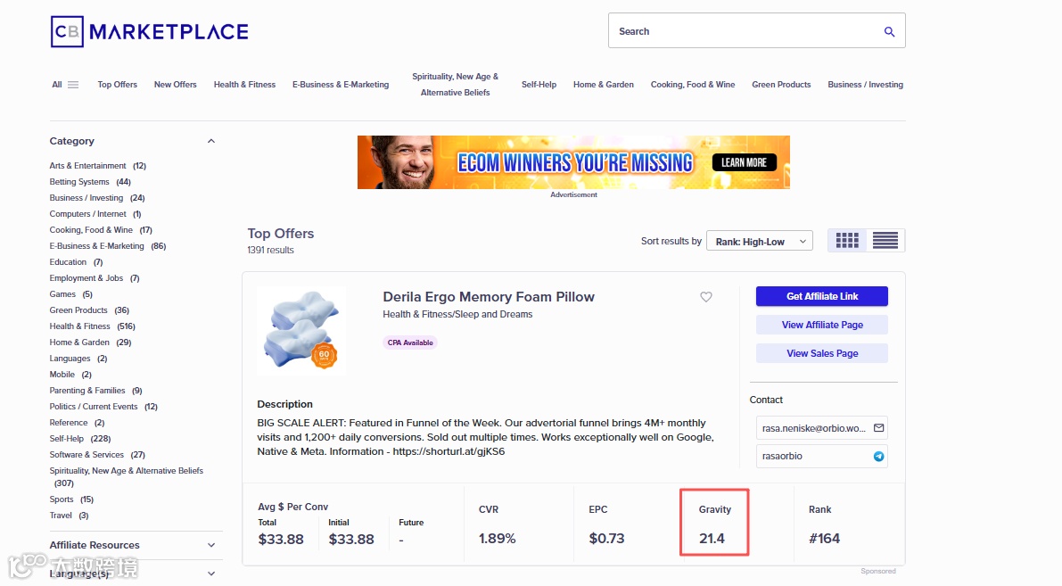 然后就是这个平台最核心的选品指标:Gravity score,也就是重力分。这个词听着挺专业,其实特别好理解,你就把它当成:最近 30 天里,有多少个联盟推广者靠这个产品赚到了钱。所以这个数值,肯定是越高越好,数值越高,说明这个产品越能出单、越容易赚到钱,跟着大多数能赚到钱的人选,总不会出错。