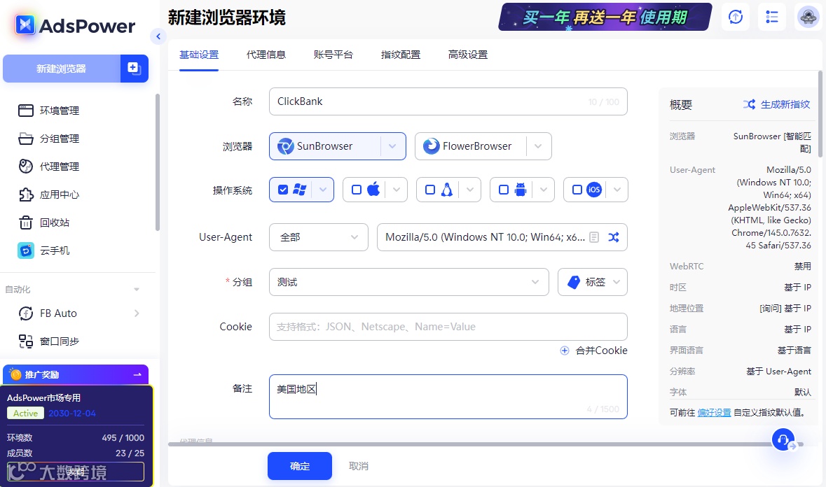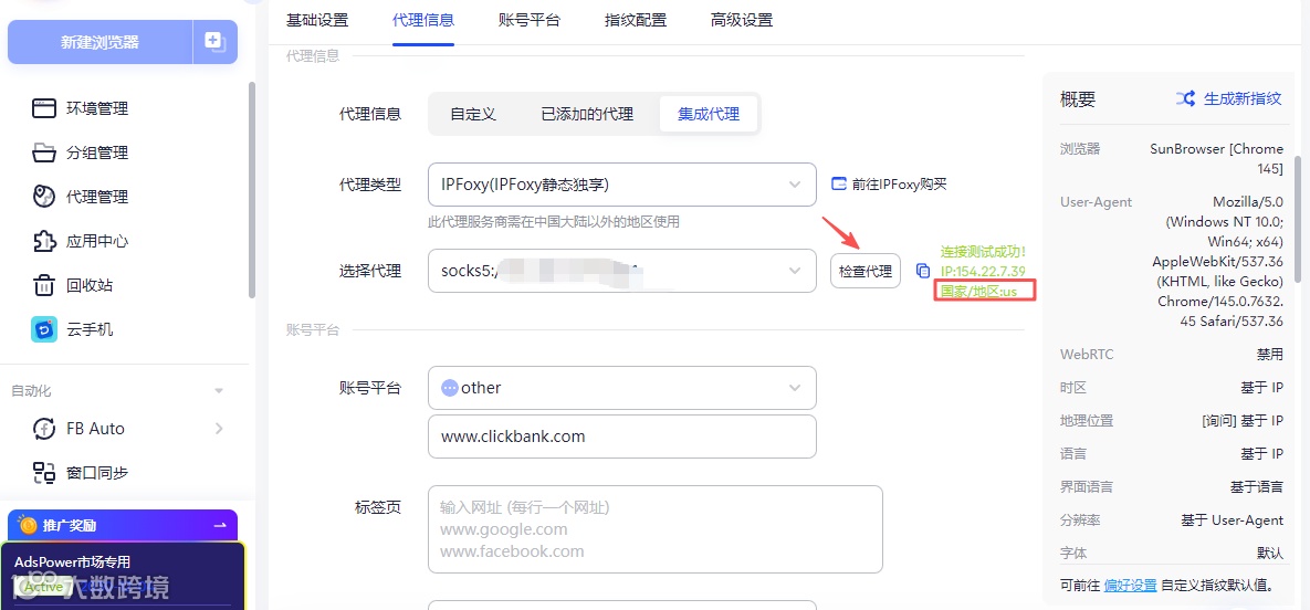 最稳妥的解决办法,就是用AdsPower 指纹浏览器。它能给每个账号创建独立、隔离的浏览器指纹环境,搭配纯净的海外住宅 IP,完美模拟美国本土用户的设备和网络环境,不仅能大幅提升 ClickBank 账号的注册通过率,后续多平台引流账号运营时,能做到一个环境对应一个账号,从根源上避免账号关联封号,一站式解决海外联盟营销的全流程环境风控问题,做海外项目的人基本都在用,新手用它能少走 90% 的弯路。
