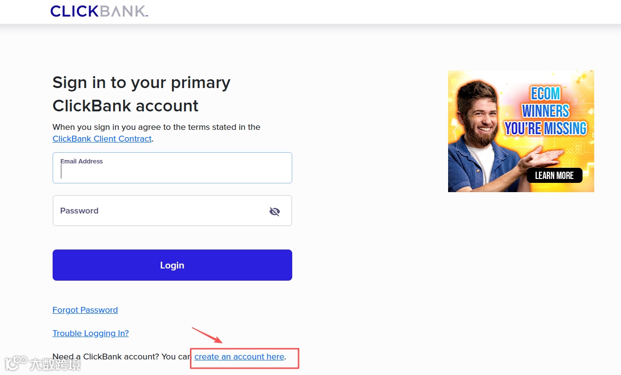 来到 ClickBank 官网,点击右上角 Login 后再点击新建账号开始注册。