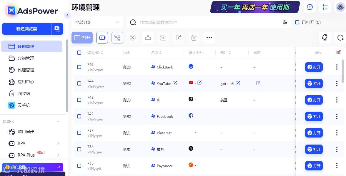 这些收款和 AI 工具账号都可以用 AdsPower 指纹浏览器分环境创建,然后统一在你的设备上集中管理。
