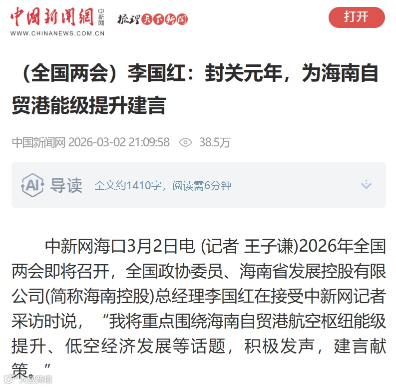 2026年全国两会即将召开,全国政协委员、海南省发展控股有限公司(简称海南控股)总经理李国红在接受中新网记者采访时说,“我将重点围绕海南自贸港航空枢纽能级提升、低空经济发展等话题,积极发声,建言献策。”