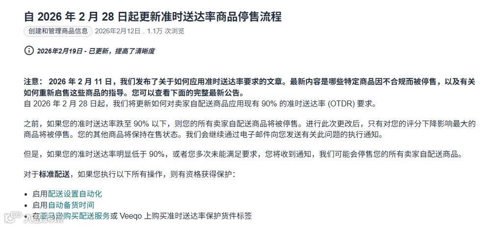 2026年2月28日起,亚马逊美国站正式更新了准时送达率(On-Time Delivery Rate, OTDR)的执行逻辑。